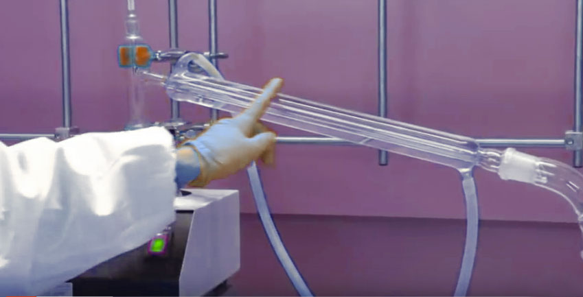 Il sistema di distillazione è solitamente composto da due palloni, collegati da un sistema di raffreddamento ad acqua, detto anche refrigerante. Questo è collegato alla rete di distribuzione dell’acqua con due tubi in gomma.